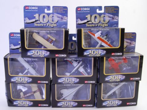 A set of Eight diecast Corgi planes in their original boxes titled '100 Years Of Flight'. Models include Concorde, The Boeing Clipper etc. Box codes include CC90138, CC90137,           CC90140, CC9013, CC90111, CC90139, CC90112, CC90110.
