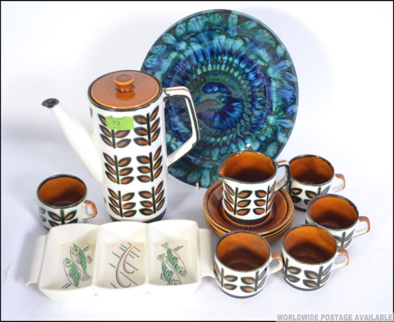 A retro 1970's Belgium made coffee service by Rambouillet to include coffee pot, cups etc along with a Poole pottery dish and a studio pottery plate by Bwthyn pottery.