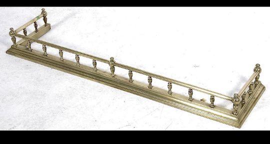 A late 19th century Victorian brass spindle gallery fire fender having spindle gallery over bar with central finials. Measures: 126cm wide x 27 cms deep.