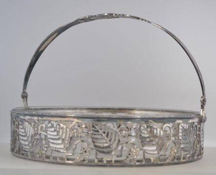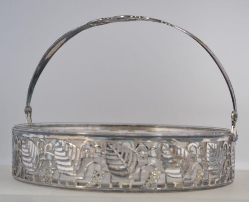 A fine Art Deco silver plate and glass basket with pierced leaf and grape decoration.