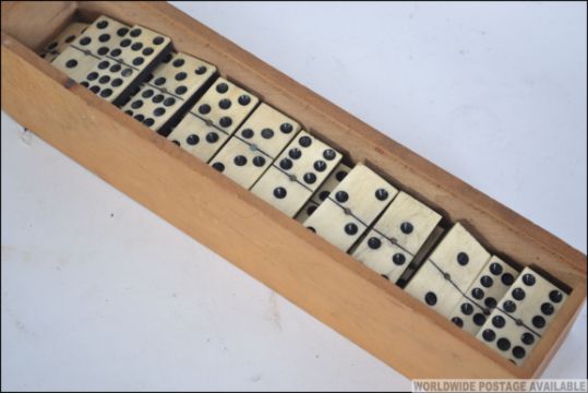 A cased set of late 19th century bone and Ebony studded dominoes, the dominoes going from numbers one to nine. 52 dominoes in all.