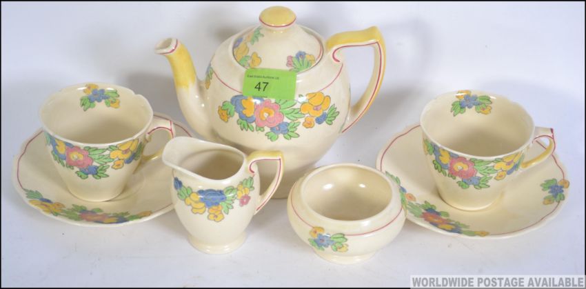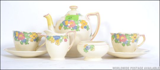 A pretty vintage 1930's Royal Doulton chintzy breakfast tea set. Consisting of a pair of trio's, teapot, creamer and sugar bowl.