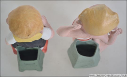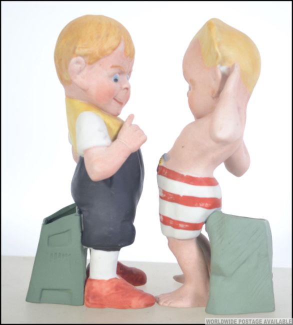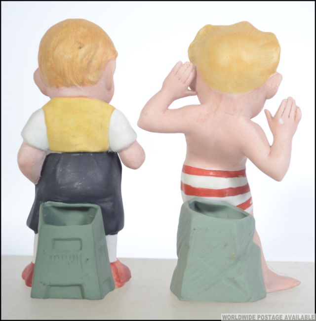 A pair of early 20th century Schafer & Vater Figural bisqueware match holders to include naughty boy in bathing costume with bee / wasp and a boy with tall black shorts having pointed finger. Measures: 15cms high.
