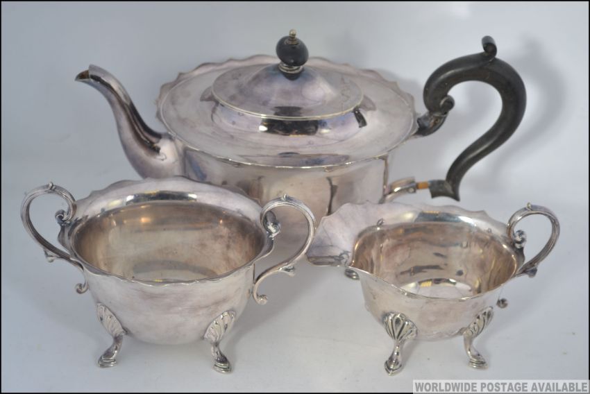 A silver plate 3 piece tea service comprising teapot, sugar bowl and creamer marked for WS&S ( Frederick Shirtcliffe ) EPNS A1. Measures: 14cms long.