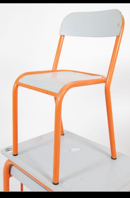 2 French vintage school desks with matching chairs . High design appeal . Mid to late 20th century painted grey wood with powder coated frames . 1 RED AND 1 ORANGE colourway . Measures: 66cms high x 60cms wide x 45cms deep.