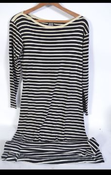 An original Jean Paul Gaultier blue and white sailor stripped ' Breton ' dress. Size L 38" and 50" long with labels to inside. With the original carrier bag from point of purchase