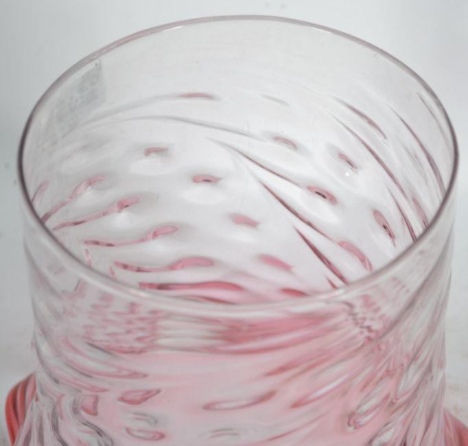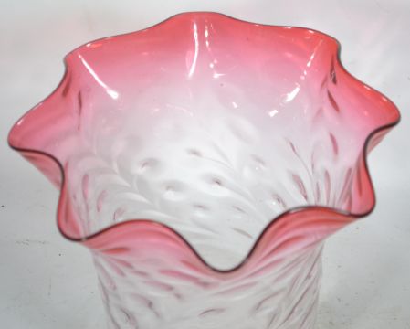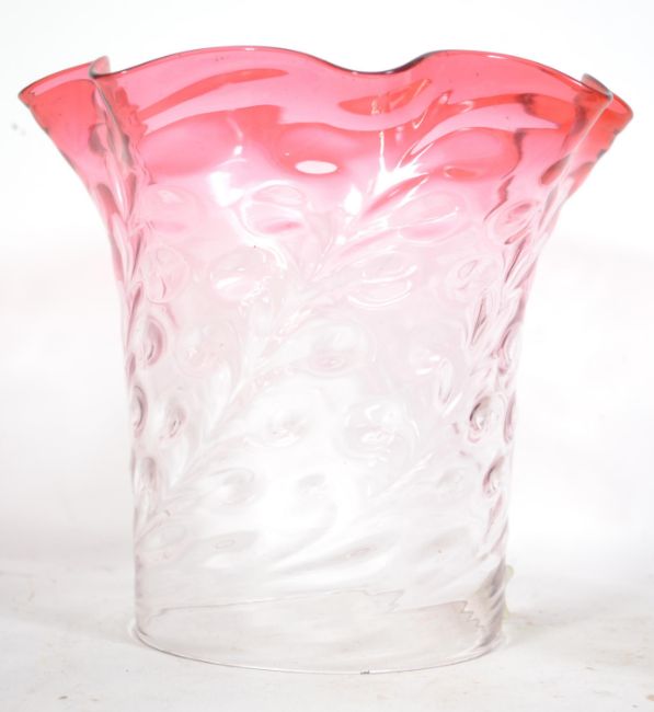 An early 20th century part cranberry and clear glass oil lamp shade with scalloped edgings