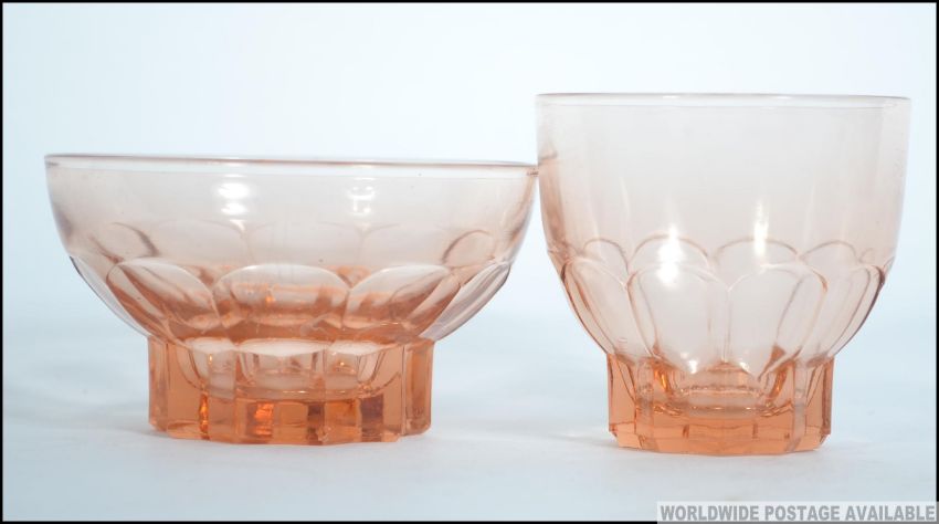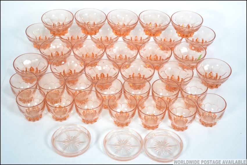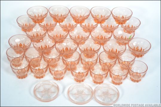 A good collection of vintage 20th century French peach glass sorbet dishes and glasses. Please see images. Measures: 6cms high.