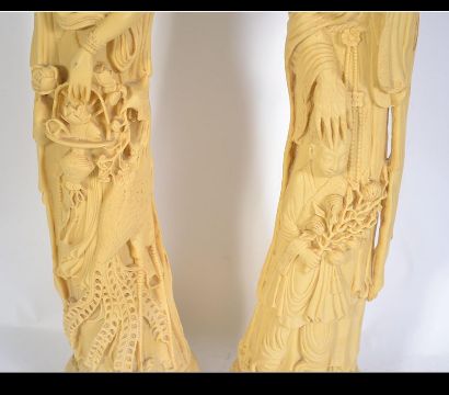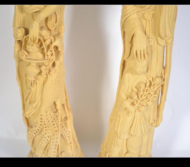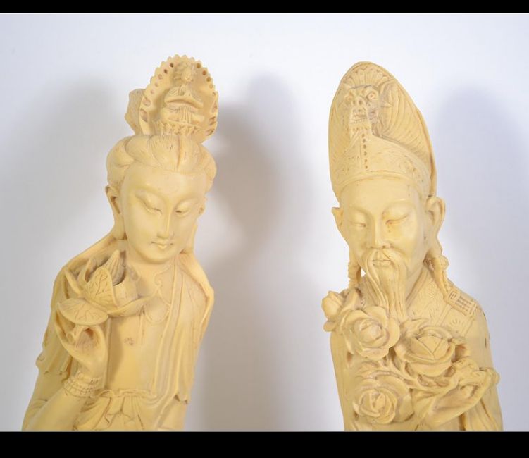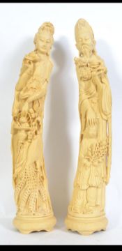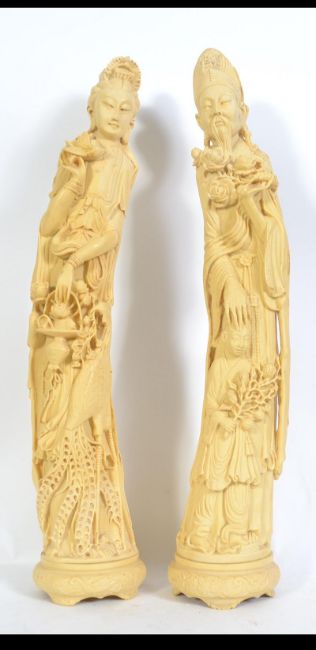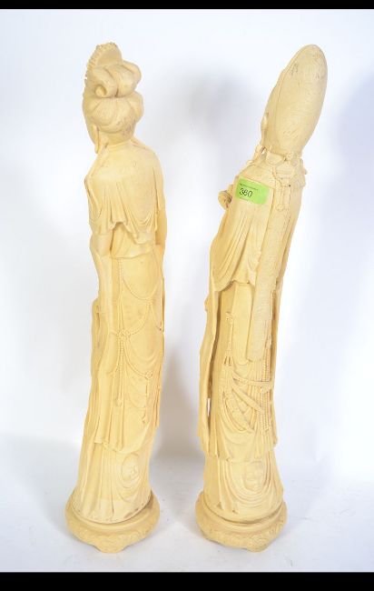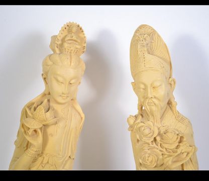 A pair of tall molded plaster figures of Chinese origins of male and female form. The lady with lotus flowers and the man with a young child. Measures: 67cms high.
