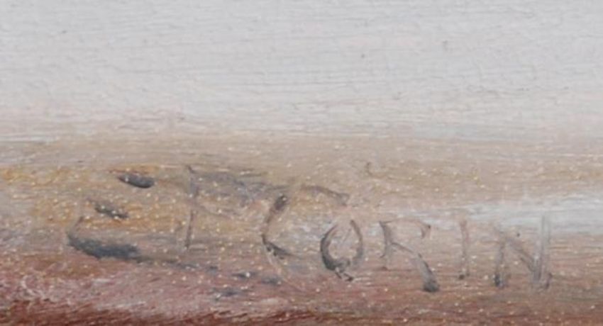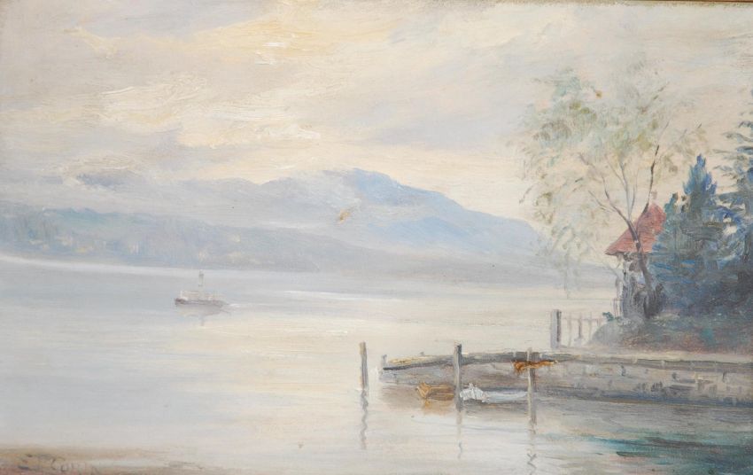 E.P. Corin - Early 20th Century Oil on board painting showing a mountainous lake scene with mountains in the distance, signed to bottom left