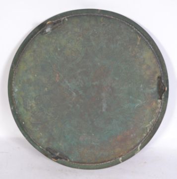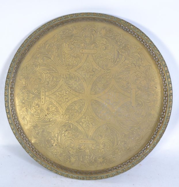 A large 19th century central European brass engraved salver tray with pierced gallery having an applied acanthus leaf edge.