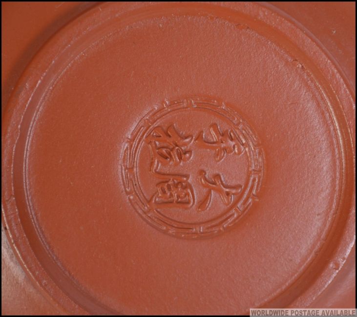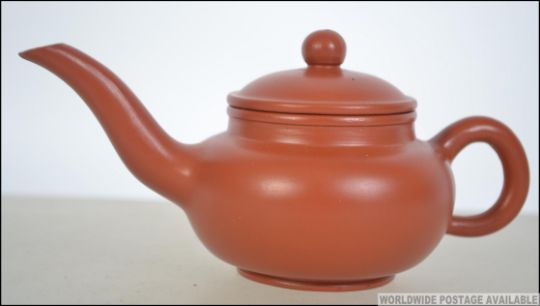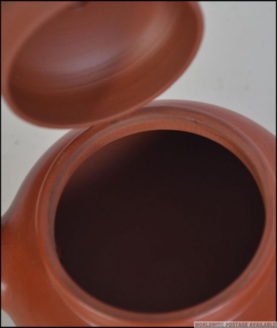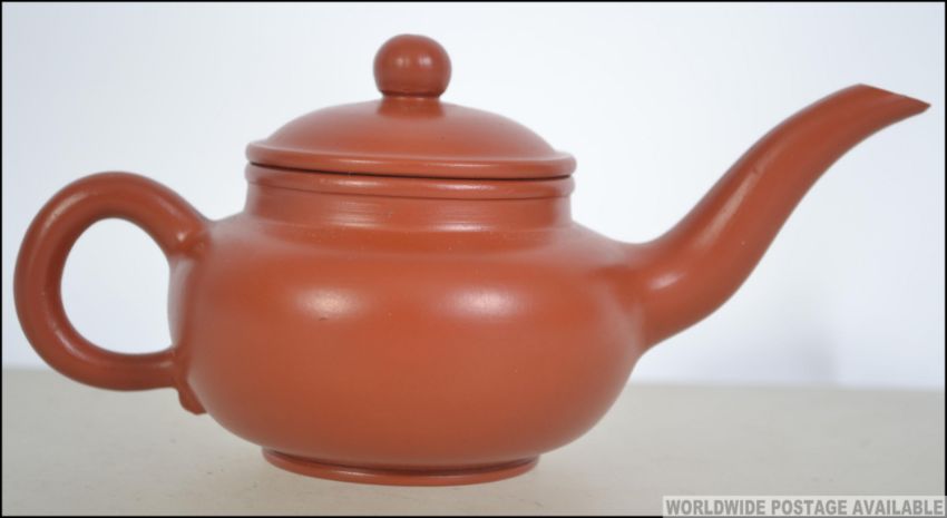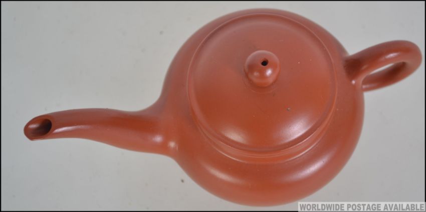 A Chinese terracotta yi-xing teapot complete with the lid having incised markings to the base. Measures: 6cms high.