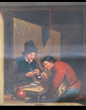 A good pair of original Continental framed and glazed unusual oil on tin paintings depicting men smoking clay pipes in an alehouse / pub . Labelled to verso J.H. Welsh picture framer Bristol , 1921 . Both unsigned . Measures: 20cms high x 16cms wide.
