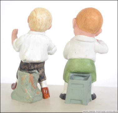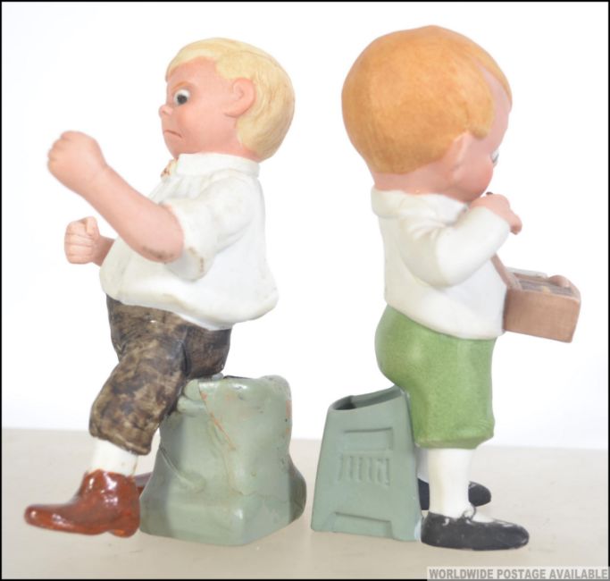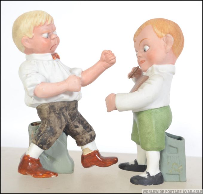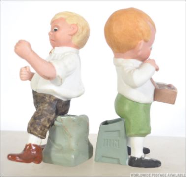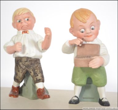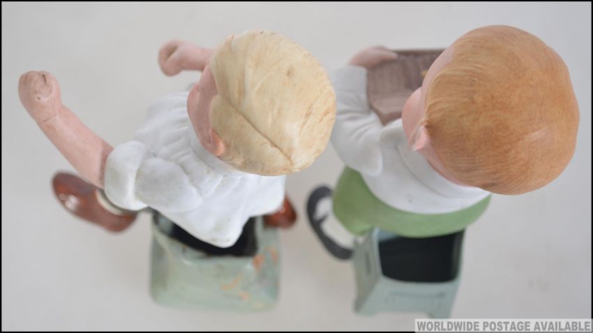 A pair of early 20th century Schafer & Vater Figural bisqueware match holders to include a boxing boy in dickie bow and brown shoes together with naughty boy with cigar and cigar box. Measures: 17cms high.