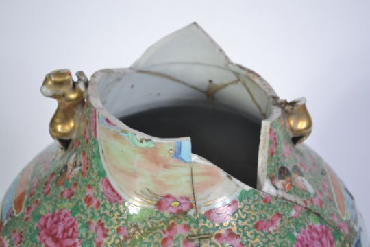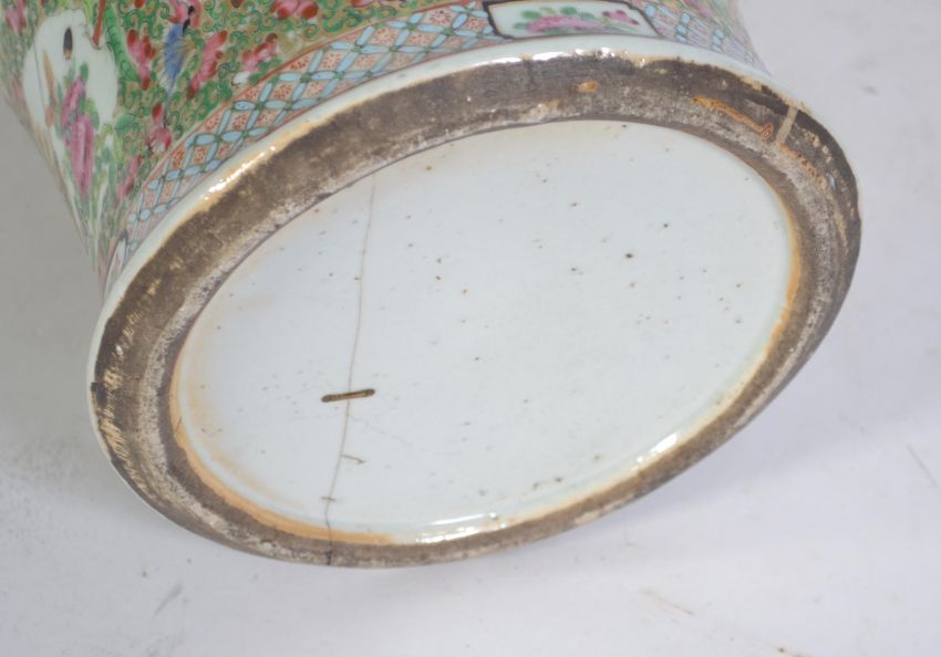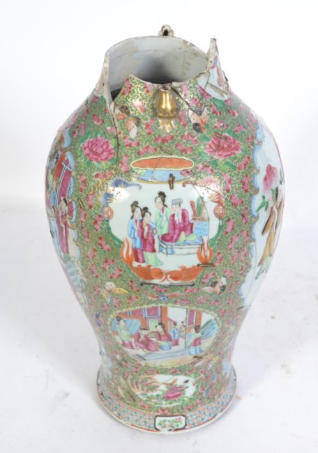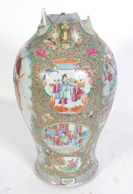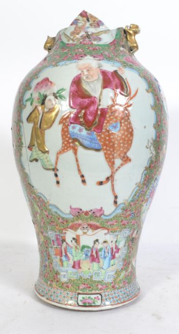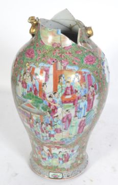 A 19th century Canton / Chinese large baluster floor vase stylised with foliates surrounding vignettes of and immortal riding a deer in relief followed by an attendant carrying a peach, people - court scenes having fu dogs with the neck ( af )
