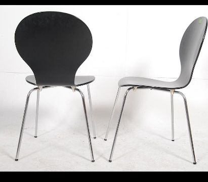A pair of 20th century original retro designed chrome and ply chairs. Measures 86cms high x 44cms wide x 54cms deep.