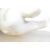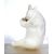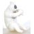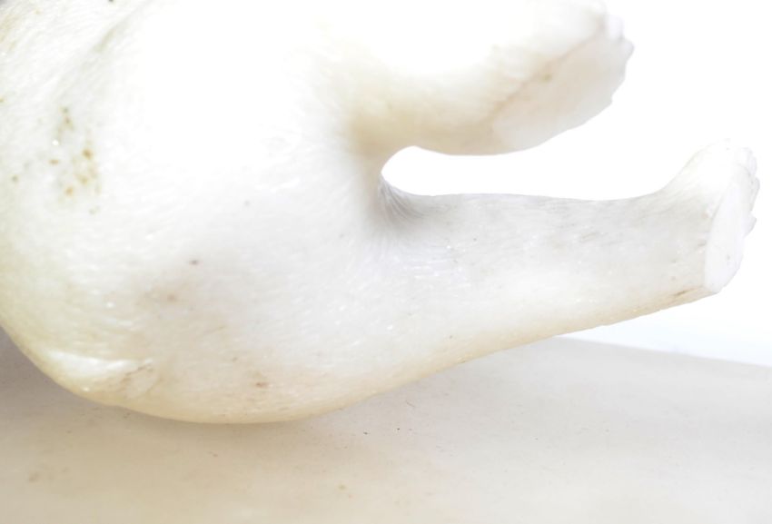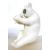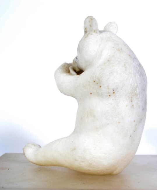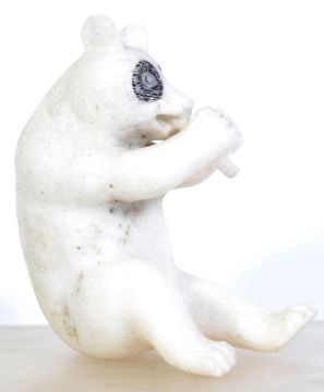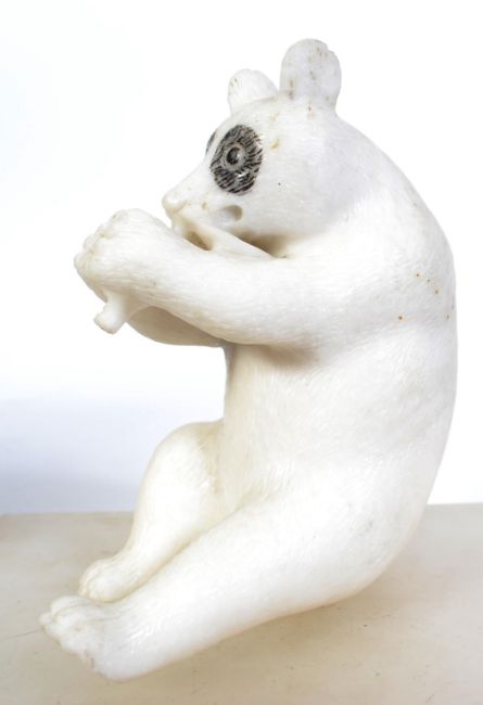 A carved white marble figurine of a panda bear eating bamboo. The bear in seated position.