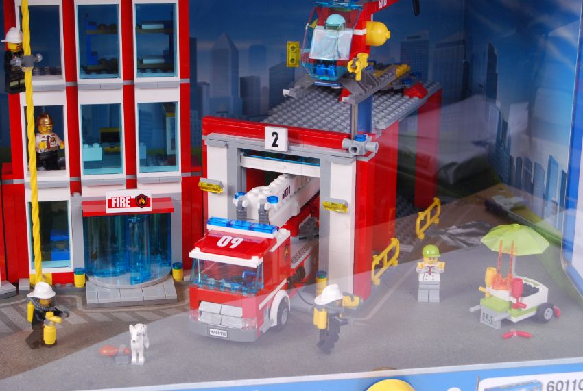 LEGO SHOP DISPLAY: An original Lego Shop Display cabinet, featuring City Set 60110 Fire Station. Fully working with working multi-stage lights, and rotating helicopter blades. Impressive display. 38cm x 60cm x 39cm.