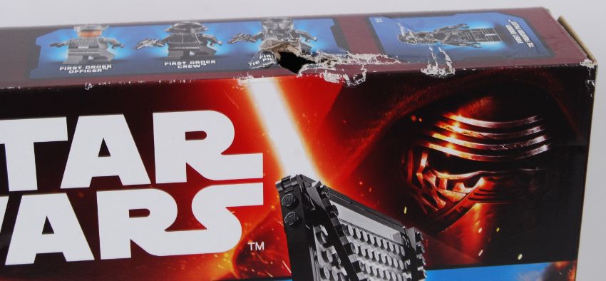LEGO STAR WARS: A Lego Star Wars set 75101 'First Order Special Forces Tie-Fighter'. Factory sealed, unused and unopened within the original box. Box has one sellotape tab which has naturally come loose, and damage to top portion (see images). Otherwise good, and unopened.