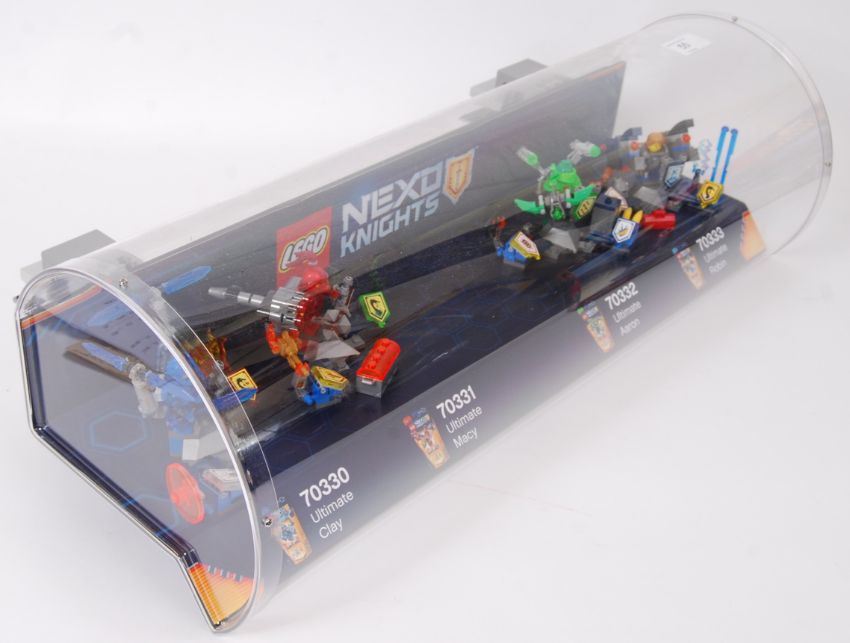 LEGO NEXO KNIGHTS: An original Shop Display Lego Nexo Knights shelf cabinet - featuring 4x Nexo Knights sets; 70330, 70331, 70332 and 70333. 56cm long, 18cm tall. Complete with mounting brackets.