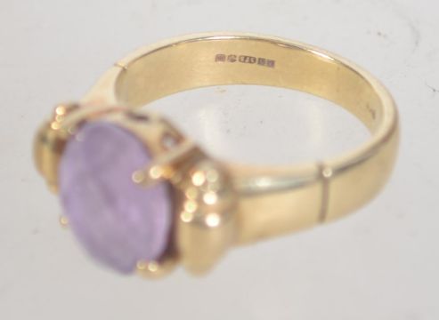 A hallmarked 9ct gold faceted amethyst ladies dress ring having scroll shoulders. Hallmark London import 375. Total weight 5.1g / Size K.5