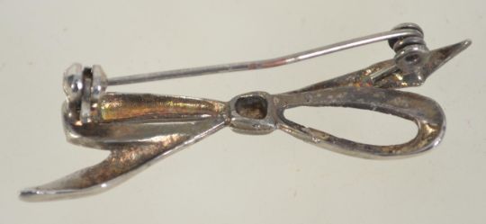 A silver brooch in the form of a bow with roller clip clasp. Marked Silver. Measures 2 1/4 inches.