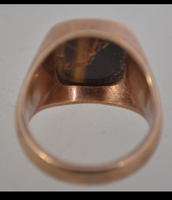 A hallmarked 9ct gold signet ring set with tigers eye. Hallmarked Birmingham. Total weight 12.9g. Size T. Chip to tigers eye.