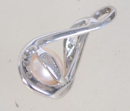 A hallmarked 9ct white gold diamond and peal pendant with crossover bale. Measures 2cms.