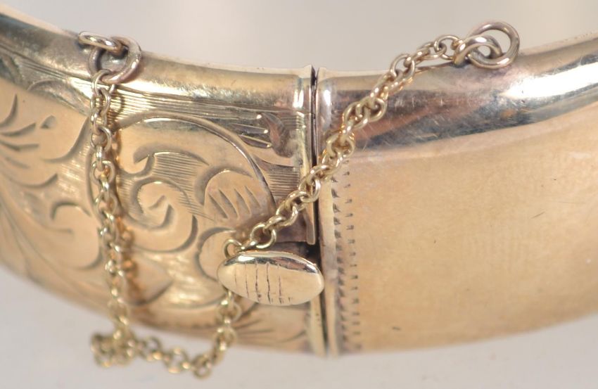 A large 9ct gold / 375 hallmarked ladies bangle complete with the safety clasp. Stamped for Birmingham 1991, makers S.P.S.& CO. Total weight 26g