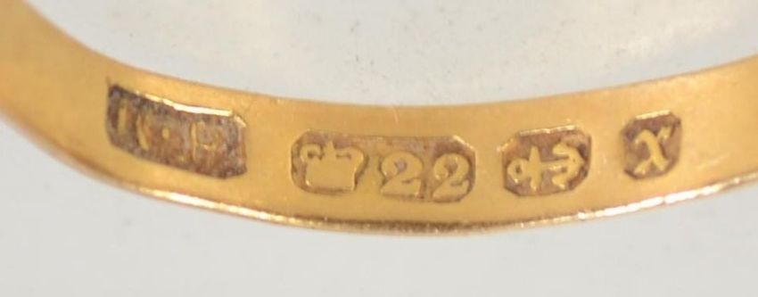 A Victorian hallmarked 22ct gold sapphire and diamond ring in a gypsy mount set with a central sapphire stone with two adjacent diamonds. Weight 2.4g. Size N. Hallmarked Birmingham 1897.