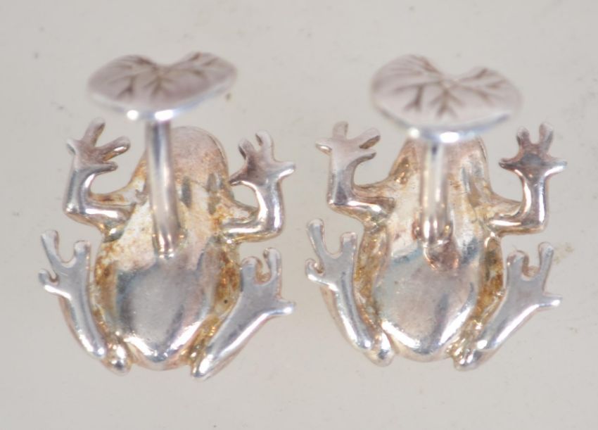 A pair of contemporary 925 silver figural cufflinks in the form of frogs with green gem eyes. Hallmarked London with TP makers mark for Thomas Pink. Weight 19.7g. Measures 2cms.