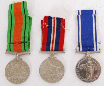A medal group belonging to constable James Sauter comprising of WWII Defence Medal, War medal & Exemplary Police Service Medal. All with ribbons.  POSTAGE: Worldwide postage / delivery available on all items. Combined postage available; UK £15.99+VAT, Ireland from £19.99+VAT, Europe from £19.99+VAT, USA / Canada from £30+VAT. Any other destinations please get in touch for a quote; info@eastbristol.co.uk. All quotes dependant upon location. Prices are per parcel (not per item).