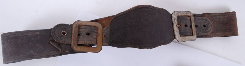 An early 20th century, likely pre-WWI leather tooled children's or ladies gun belt bandolier. Along with some whistles and service WVS badge.  POSTAGE: Worldwide postage / delivery available on all items. Combined postage available; UK £15.99+VAT, Ireland from £19.99+VAT, Europe from £19.99+VAT, USA / Canada from £30+VAT. Any other destinations please get in touch for a quote; info@eastbristol.co.uk. All quotes dependant upon location. Prices are per parcel (not per item).