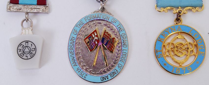 A set of 3x original Masonic Lodge medals. 1992 '25th anniversary of the Grand Lodge', 'St. Kenya Lodge 1879 No 1833' and lettered medal. All have original ribbons.  POSTAGE: Worldwide postage / delivery available on all items. Combined postage available; UK £15.99+VAT, Ireland from £19.99+VAT, Europe from £19.99+VAT, USA / Canada from £30+VAT. Any other destinations please get in touch for a quote; info@eastbristol.co.uk. All quotes dependant upon location. Prices are per parcel (not per item).