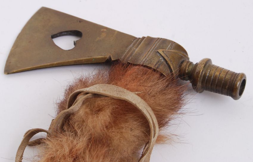A 20th century Indian Tomahawk axe / pipe. Elongated carved wooden shaft with brass axe head decorated with heart motif. 57cm long. POSTAGE: Worldwide postage / delivery available on all items. Combined postage available; UK £15.99+VAT, Ireland from £19.99+VAT, Europe from £19.99+VAT, USA / Canada from £30+VAT. Any other destinations please get in touch for a quote; info@eastbristol.co.uk. All quotes dependant upon location. Prices are per parcel (not per item).