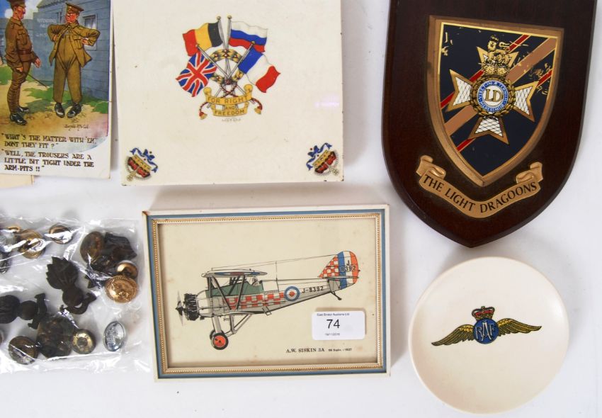 This lot contains; 2 plaques of the Grenadier Guards and the Light Dragoons. 2 aircraft prints, A.W Siskin 3A (56 sqdn 1927) and a Gloster Gauntlet 1 (19 sqdn 1935). Some buttons and badges, WW1 peace tea pot stand with a flag of the allies. A RAF small dish by Guild Crafts (Poole). Ephemera including, the Devonshire regiment 1937 and Battle of Britain commemoration services at Liverpool cathedral.  POSTAGE: Worldwide postage / delivery available on all items. Combined postage available; UK £15.99+VAT, Ireland from £19.99+VAT, Europe from £19.99+VAT, USA / Canada from £30+VAT. Any other destinations please get in touch for a quote; info@eastbristol.co.uk. All quotes dependant upon location. Prices are per parcel (not per item).