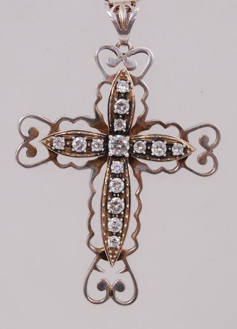 A 925 silver contemporary statement pendant necklace strung with a large gem set crucifix. Chain marked 925 Italy, crucifix with European standard mark 925 maker Eco.