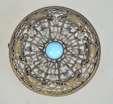A large 1920s Czech silvered brass filigree brooch set with faux turquoise rhinestones having trombone clasp. Marked Czechoslovakia. Measures 5.7cms