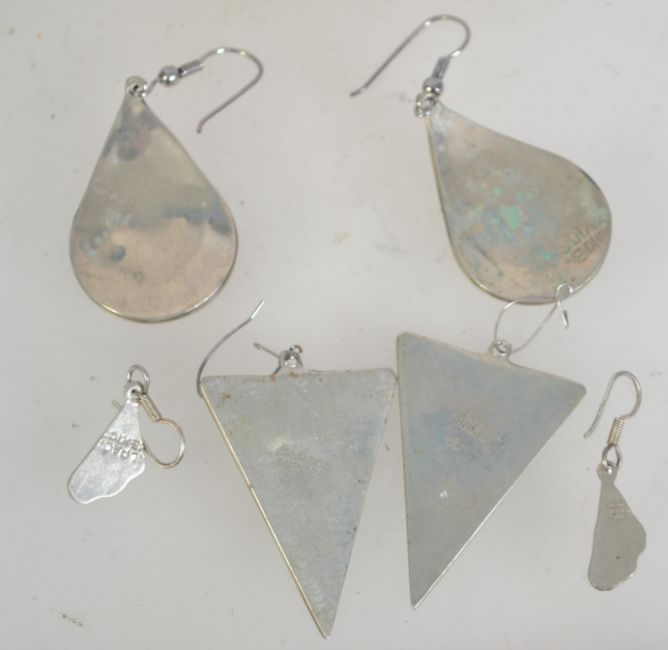 Two pairs of Alpaca white metal earrings inlaid with shell. Marked Alpaca Mexico.