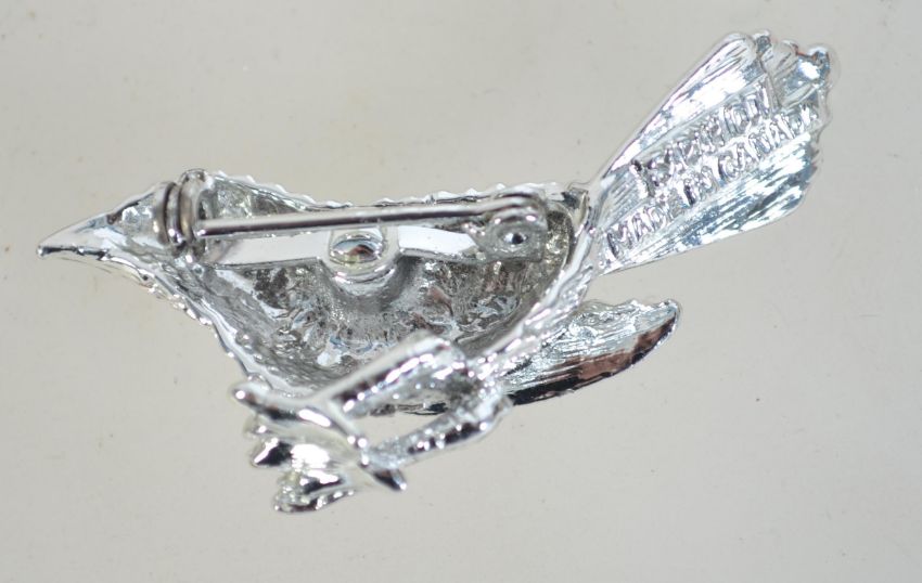A vintage Sarah Coventry silver tone figural brooch in the form of a Wren bird with red rhinestone eye. Marked Sarah Cov. Made in Canada.