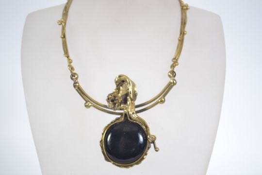 An Art Nouveau style pendant necklace with large black french jet cabochon. Measures approx 18 inches.
