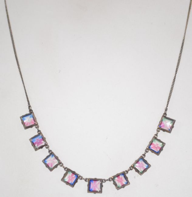 A vintage white metal and coloured glass bead necklace. Measures 16 inches