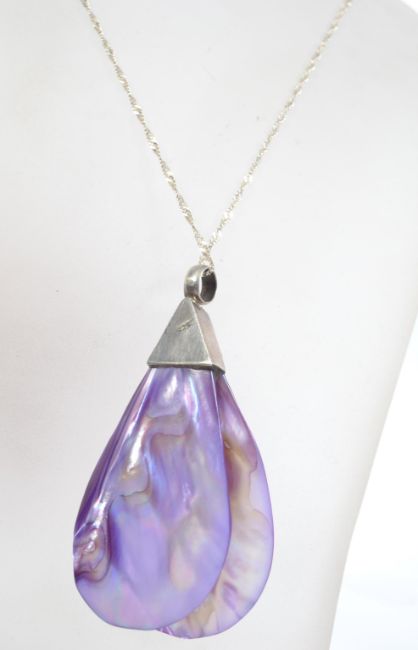 A 925 silver pendant necklace with mother of pearl gem set pendant strung on an Italian silver chain. Measures 28 inches. Pendant 3 inches. Both marked 925