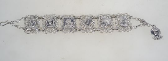 A vintage white metal link bracelet with Japanese, Roman, and Egyptian motif links with hook clasp.
