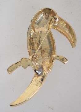 A large goldtone enamel and rhinestone set figural brooch in the form of a Toucan. Measures 7.5cms.