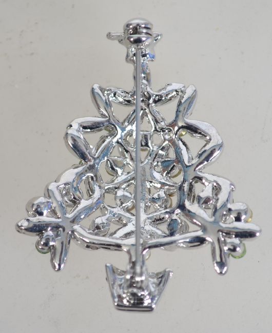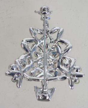 A vintage rhinestone Christmas tree brooch in silvertone metal with a roll over catch. Measures 4.8cms