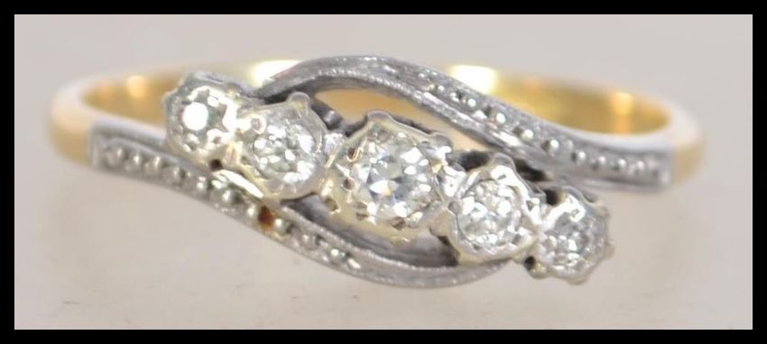 An 18ct gold platinum and diamond 5 stone ring in a cross over design. The diamonds approx 20pnts. Size S / Weight 3.2g marked 18ct and Plat. Tests 18ct gold and platinum.