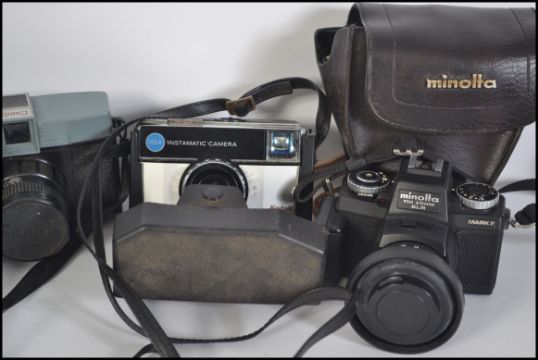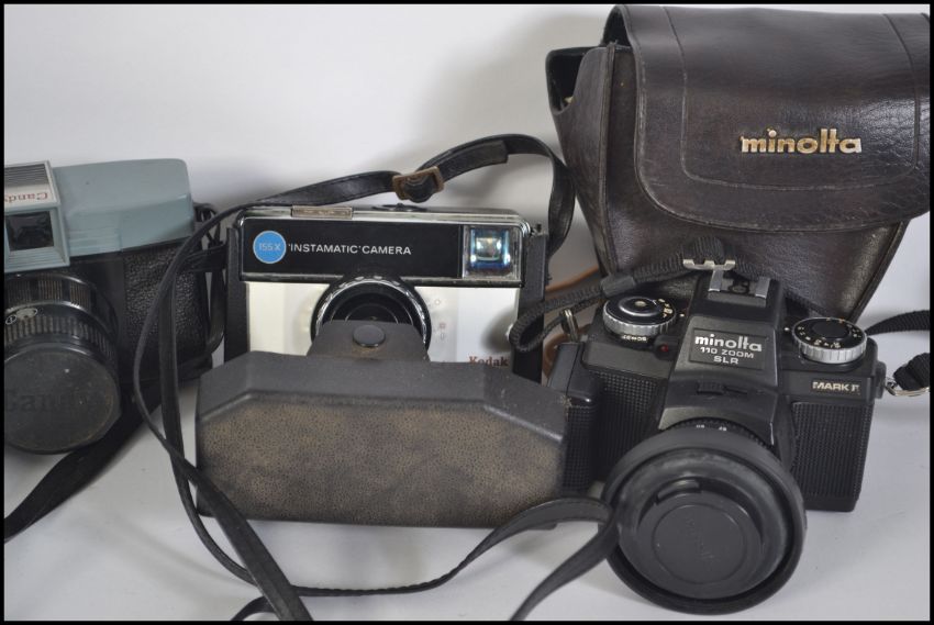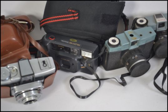 A collection of vintage cased  cameras to include 35mm examples such as Kodak, Minolta etc