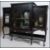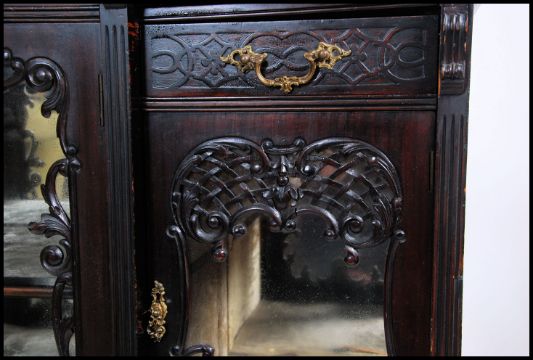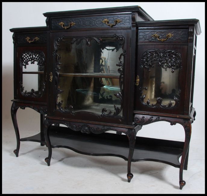 An Edwardian ebonised aesthetic movement display cabinet chiffonier raised on cabriole legs with rococo carved wide body comprising a series of 3 velvet lined display cabinets with single drawers above. The drawers with blind fret decoration and lattice worked facia's to the glass doors. Measures 110cm high x 137cm wide x 45cm deep.