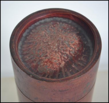 An early 20th century Chinese bamboo chinoserie painted brush pot with lid Decorated with plant pot scene being slightly worn. Measures 22cms high.
